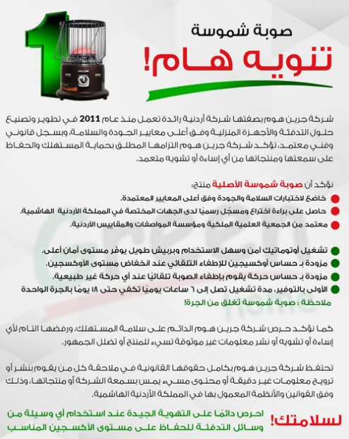 في الوقت الذي نشرت فيه مديرية الأمن العام تحذيرا دعت فيه المواطنين إلى إيقاف استخدام صوبات من ماركة شموسة فورًا، على خلفية تسجيل حالات اختناق خلال الساعات الأربع والعشرين الماضية، اعلنت الشركة الصانعة احتفاظها بحقها القانوني في ملاحقة أي جهة أو شخص يقوم بالإساءة إلى سمعتها أو التشكيك...