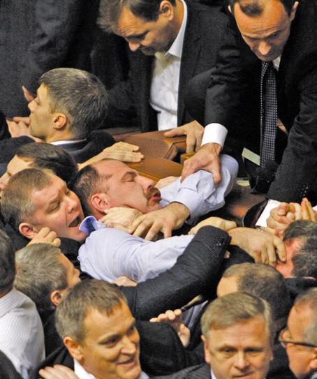 وتعاركت مجموعة من النواب حول المنصة الرئيسة في البرلمان بعد أن حاول نواب المعارضة أن يمنعوا بأنفسهم اقتراعاً على مرشح حزب الأقاليم الحاكم لمنصب رئيس البرلمان.