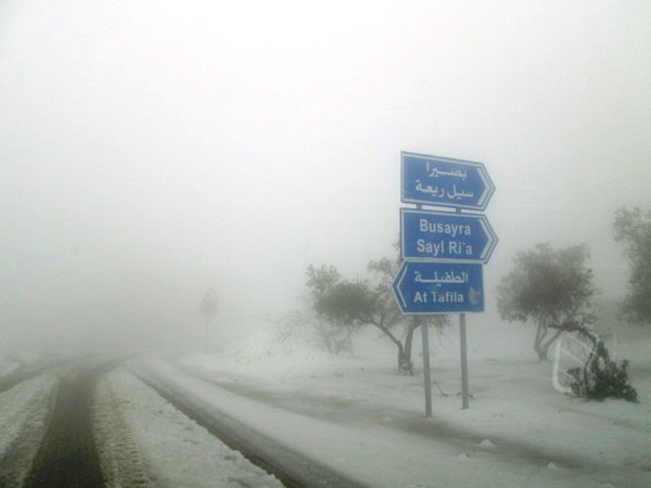 معان , حيث شهدت عدد من قرى لواء بصيرا بالطفيلة تساقطاً للثلوج بينما تساقط الثلج بمنطقتي المريغة وراس النقب بمحافظة معان .