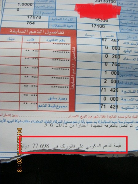 احمد عريقات - في أخر فاتورة الكهرباء التي تصل لمنزل كل مواطن أردني جملة توضح بها الحكومة حصتها في قيمة فاتورة الكهرباء ، وهذه الطريقة تستخدمها الحكومة وشركة الكهرباء كخطوة إستباقية من طرفها عندما يتم رفع اسعار الكهرباء لتبادر المواطن بجملة واحدة .. نحن كنا نكتب لكم على الفاتورة حصة الدعم التي نتحملها عنكم .