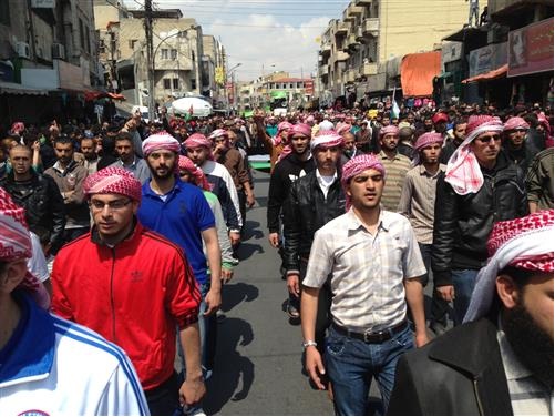 وتقدم المسيرة شباب من جماعة الاخوان المسلمين بمشية عسكرية استعراضية ، موجهين رسائل "ناريةّ" الى الدولة الاردنية مفادها ان الحزب قادر على الرد على الاعتداءات بنفسه .