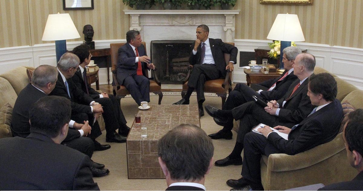عقد جلالة الملك عبدالله الثاني والرئيس الأميركي باراك أوباما في البيت الأبيض في واشنطن اليوم الجمعة لقاء قمة تناولت العلاقات الثنائية بين البلدين وسبل تعزيزها، وتطورات الأوضاع في الشرق الأوسط، خصوصا الأزمة السورية وتداعياتها، وجهود تحقيق السلام الشامل والعادل.