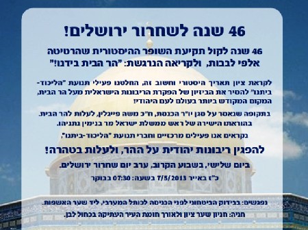 اعلن نشطاء في حزب " الليكود بيتنا" الذي يتزعمه رئيس الحكومة الإسرائيلية بنيامين نتنياهو نيتهم اقتحام المسجد الأقصى المبارك صباح الثلاثاء 7/5/2013 ، استذكاراُ لمشاهد اللحظات التاريخية عند احتلال المسجد الاقصى عام 1967م ، وبهدف تعزيز مفهوم السيطرة الاسرائيلية على المسجد الأقصى المبارك " جبل الهيكل" بحسب زعمهم - ، وقالت "مؤسسة الاقصى" ان عددا من نشطاء وقيادات الحزب في عدد من المدن والدوائر نشروا اعلانات بهذا الخصوص في الايام الأخيرة.