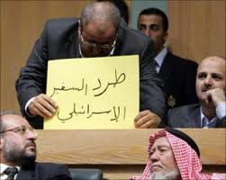 رفع عدد من النواب تحت قبة البرلمان وقبل بدء جلسة مجلس النواب مساء اليوم الاحد يافطات كتب عليها "الشعب يريد الطرد السفير" .. "والشعب يريد طرد السفير الصهيوني فوراً".