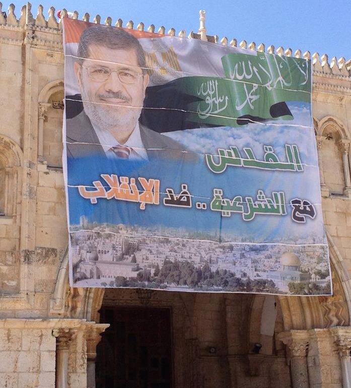 رفع مواطنون مقدسيون اليوم الجمعة صورة الرئيس المصري الشرعي محمد مرسي على أسوار القدس، في إشارة إلى رفضهم للانقلاب الذي قام به المجلس العسكري على الرئيس المنتخب.