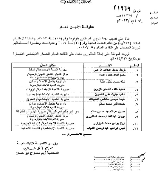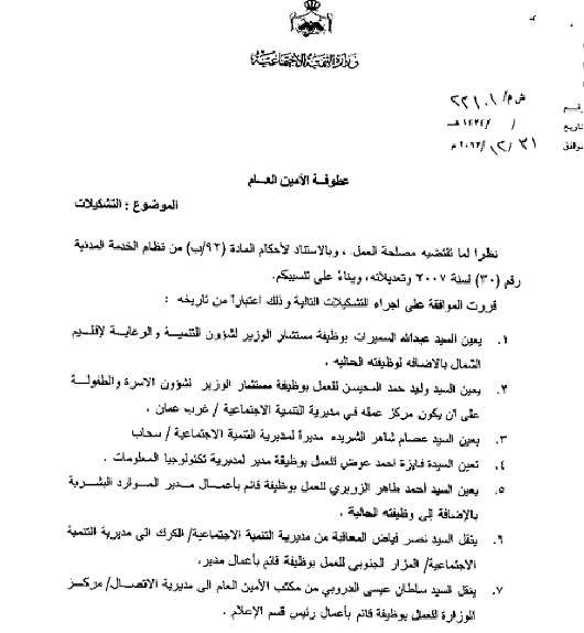 قررت وزيرة التنمية الاجتماعية ريم أبو حسان مساء امس الثلاثاء 31/12/2013 إجراء التشكيلات التالية: