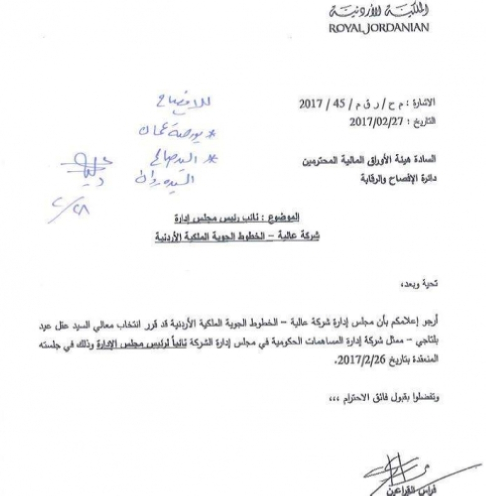 قرر مجلس إدارة الملكية تعيين معالي عقل بلتاجي ممثلا لادارة شركة المساهمات الحكومية في مجلس إدارة الشركة ونائبا لرئيس مجلس الإدارة ، وذلك اعتبارا من 26-2-2017.