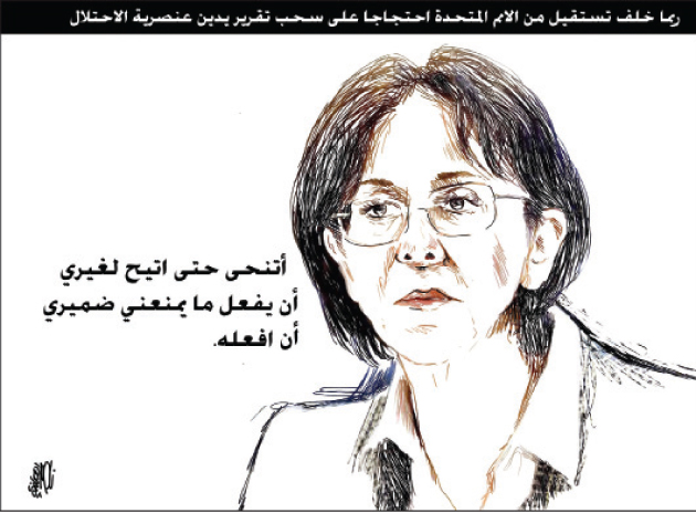 وختمت ريما خلف "عليه، وبعد إمعان النظر في الأمر، أدركت أنني أنا أيضا لا خيار لي. أنا لا أستطيع أن أسحب، مرة أخرى، تقريرا للأمم المتحدة، ممتاز البحث والتوثيقِ، عن انتهاكات جسيمة لحقوق الإنسان. غير أنني أدرك أيضا، أن التعليمات الواضحة للأمين العام للأمم المتحدة لا بد من أن تنفذ. ولذلك، فإن هذه العقدة لا تحل إلا بأن أتنحى جانبا وأترك لغيري أن يقوم بما يمنعني ضميري من القيام به. وإنني أدرك أنه لم يبق لي في الخدمة غير أسبوعين، لذلك فاستقالتي هذه لا تهدف إلى الضغط السياسي عليك. إنما أستقيل، ببساطة، لأنني أرى أن واجبي تجاه الشعوب التي نعمل لها، وتجاه الأمم المتحدة، وتجاه نفسي، ألا أكتم شهادة حق عن جريمة ماثلة تسبب كل هذه المعاناة لكل هذه الأعداد من البشر. وبناء عليه، أقدم إليك استقالتي من الأمم المتحدة".