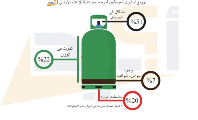 تصدر الخلل في صمامات أسطوانات الغاز قائمة شكاوى المواطنين في إجاباتهم عن سؤال تفاعلي لمرصد مصداقية الإعلام الأردني (أكيد)، في وقت تبين للمرصد أن حوادث أسطوانات الغاز تسببت بوفاة ثمانية أشخاص خلال الشهرين الماضيين، وذلك من خلال تتبع الأخبار المنشورة في الصحف اليومية.