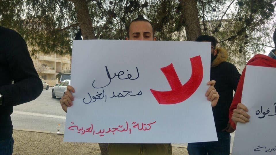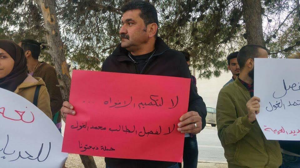 فقد أقدمت إدارة كلية الهندسة التكنولوجية "البوليتكنيك" التابعة لجامعة البلقاء التطبيقية، على فصل الطالب محمد موسى الغول الطالب في قسم هندسة الميكاترونكس في الكلية، للفصل الدراسي الحالي والفصل الصيفي القادم، وذلك على خلفية مروره ووقوفه بالقرب من اعتصام نظمته الحملة الوطنية من أجل حقوق الطلبة "ذبحتونا" خارج أسوار الكلية احتجاجاً على قرار إدارة جامعة البلقاء التطبيقية رفع رسوم الدبلوم في كافة تخصصات الهندسة التابعة للجامعة بنسبة 400%.