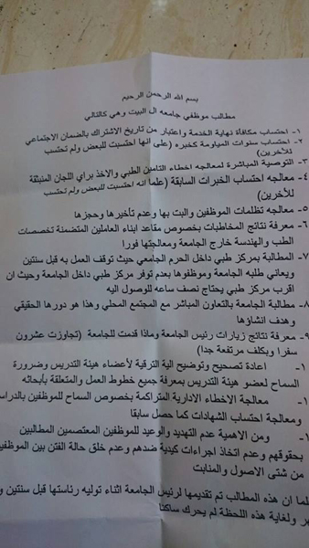وبين المعتصمين أن إدارة الجامعة كانت قد وعدت منذ توليها في وقت سابق بحل تلك القضية ولم يتخذ أي إجراء رسمي من حول ذلك، مشيرين أن القضية مرت على أكثر من رئيس جامعة دون أي حلول تذكر.