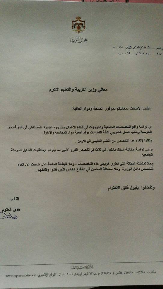 قدمت النائب هدى العتوم مقترحاً لوزير التربية والتعليم عمر الرزاز بإضافة مادتين أو ثلاثة لتخصص الفرع الأدبي كالمحاسبة والإدارة من أجل التأهيل للمرحلة الجامعية، ولكي يسهم هذا المقترح في حل مشكلة البطالة التي يعاني منها خريجو هذه التخصصات عقب إلغاء فرع المعلوماتية.