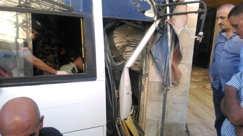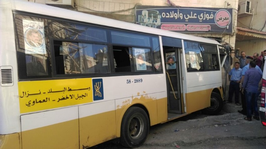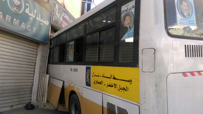 اصطدم صباح اليوم الاربعاء، باص خط، بواجهة محل تجاري في حي نزال بالعاصمة عمان، مما تسبب باصابة شخص.