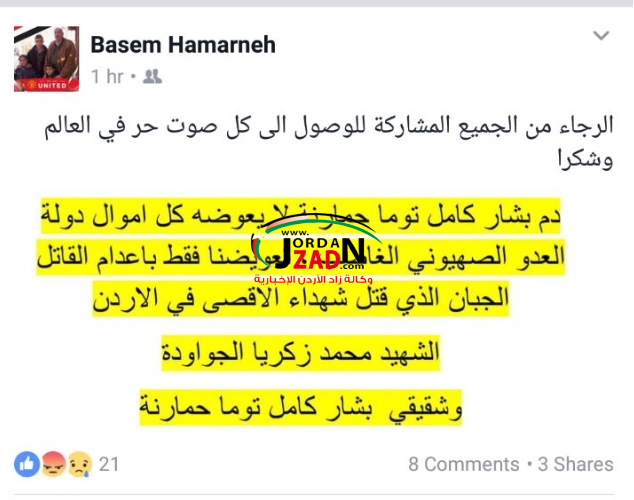 واضاف حمارنة : "تعويضنا فقط باعدام القاتل الجبان الذي قتل شهداء الاقصى في الاردن ... الشهيد محمد زكريا الجواودة وشقيقي بشار كامل توما حمارنة".