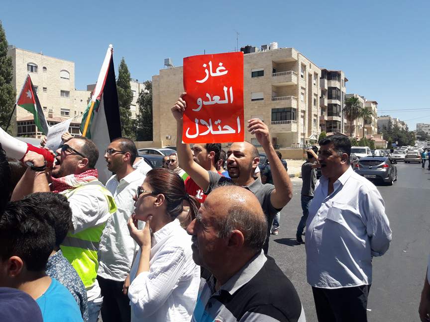 جدد العشرات خلال مسيرة انطلقت بعد صلاة الجمعة من المسجد الكالوتي بالقرب من السفارة الاسرائيلية في منطقة الرابية بالعاصمة عمان ، مطالبتهم بإلغاء اتفاقية الغاز مع "إسرائيل" والتي وقعها الأردن مؤخرا.