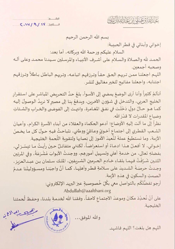 ودعا الأسرة الحاكمة والشعب القطري للتواصل معه وتحديد موعد الاجتماع لاحقاً