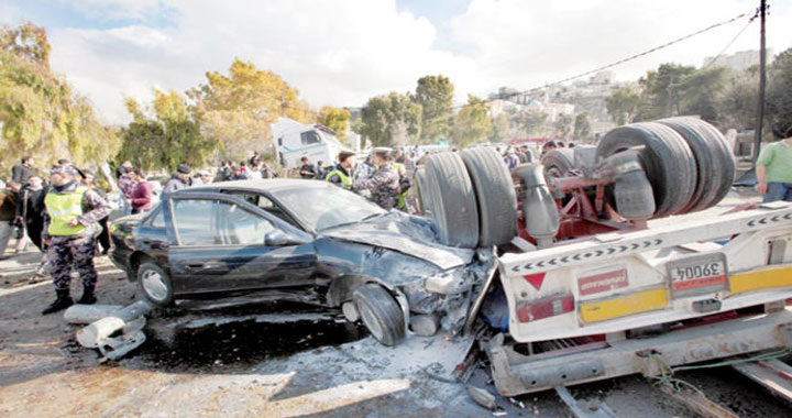 أصيب شخص بإصابات بالغة إثر حادث سير بالقرب من مطاحن الجنوب في لواء الجيزة نتيجة تصادم بين تريلا وبكب (ديانا).