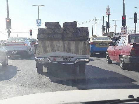 وتظهر في الصورة مركبة "بك أب" من ذوات الدفع الرباعي، محملة بأثاث منزلي، متوقفة على إشارة، في أحد شوارع مدينة الزرقاء الرئيسية.