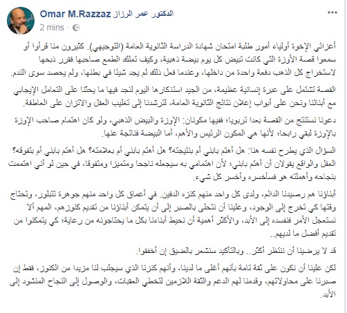 وحملت رسالة الرزاز قصة تحمل في طياتها عبرة إنسانيةـ تحثّ أهالي طلبة الثانوية العامة على التعامل الايجابي مع أبناءهم، مع اقتراب اعلان نتائج الثانوية العامة.