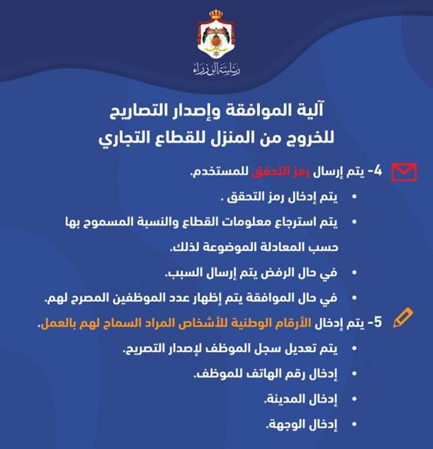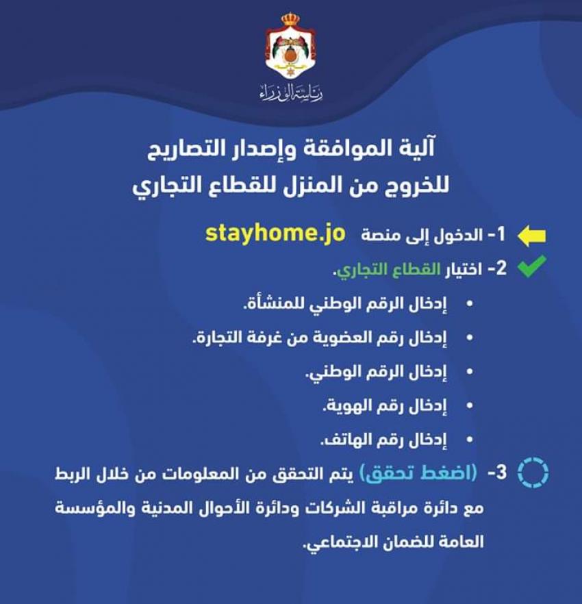 وقالت الحكومة إن على المنشآت في القطاع المصرح له والراغبة بالحصول على تصريح الدخول لمنصة (stayhome.jo)، واختيار القطاع التجاري، ثم ادخال الرقم الوطني للمنشأة، ورقم العضوية من غرفة التجارة، والرقم الوطني، ورقم الهوية، ورقم الهاتف، ثم الضغط على تحقق.
