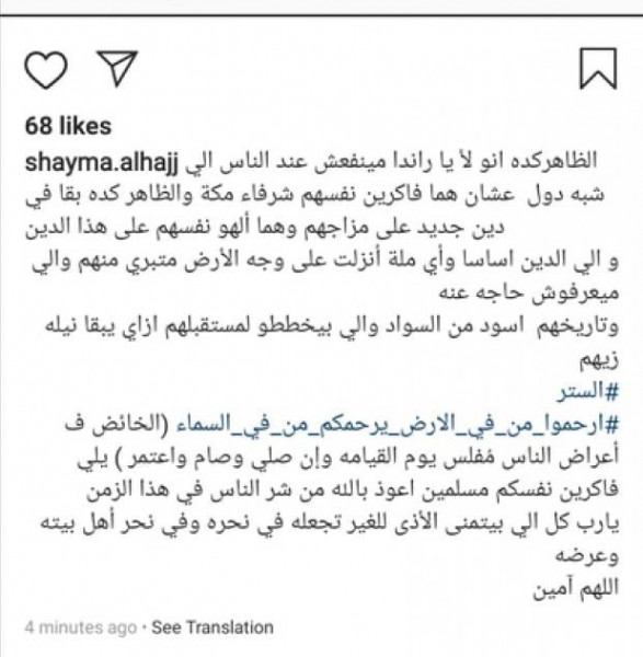 واختتمت شيماء: "يلي فاكرين نفسكم مسلمين، أعوذ بالله من شر الناس في هذا الزمن، يارب كل إللي بيتمنى الأذى للغير تجعله في نحره وفي نحر أهل بيته وعرضه..اللهم آمين".