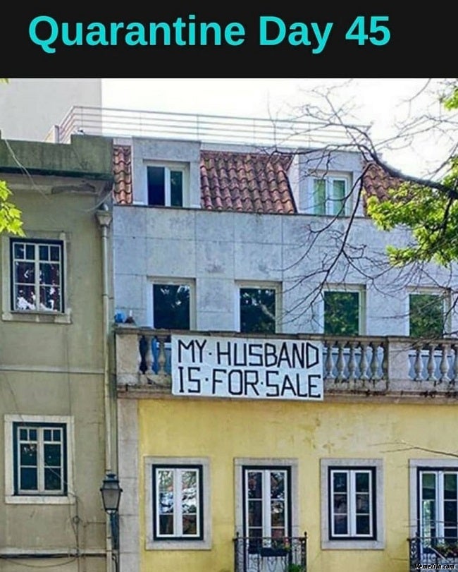 ومن بين هذه اللافتات المسلية، واحدة كتب عليها "زوجي للبيع"، معلقة على شرفة أحد المنازل في الولايات المتحدة.
