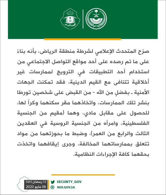 وصرح المتحدث الإعلامي لشرطة منطقة الرياض، أنه بناء على ما تم رصده عبر أحد مواقع التواصل الاجتماعي، في الترويج لممارسات غير أخلاقية تتنافى مع القيم الدينية، فقد تمكنت الجهات الأمنية من القبض على شخصين تورطا بنشر تلك الممارسات واتخاذهما مقر سكنهما وكرا لها، للحصول على مقابل مادي.