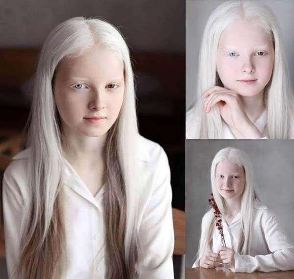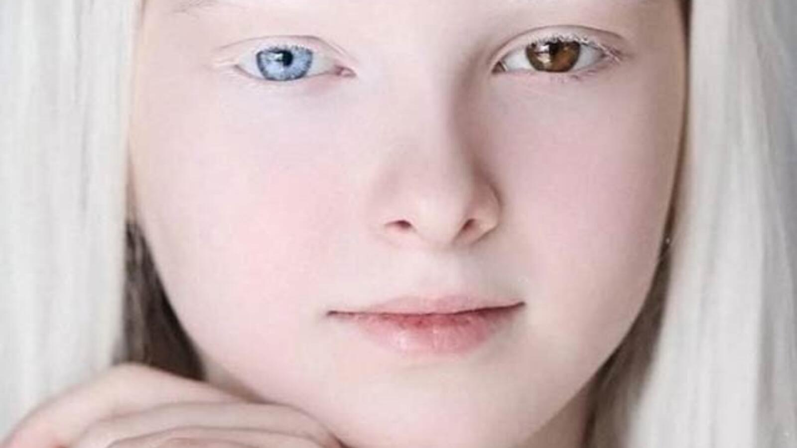 وأوضح الموقع بأن الفتاة تدين بجمالها المذهل لمزيج من الحالات الوراثية النادرة: المهق و heterochromia والتي تعني تغاير لون القزحيتين.