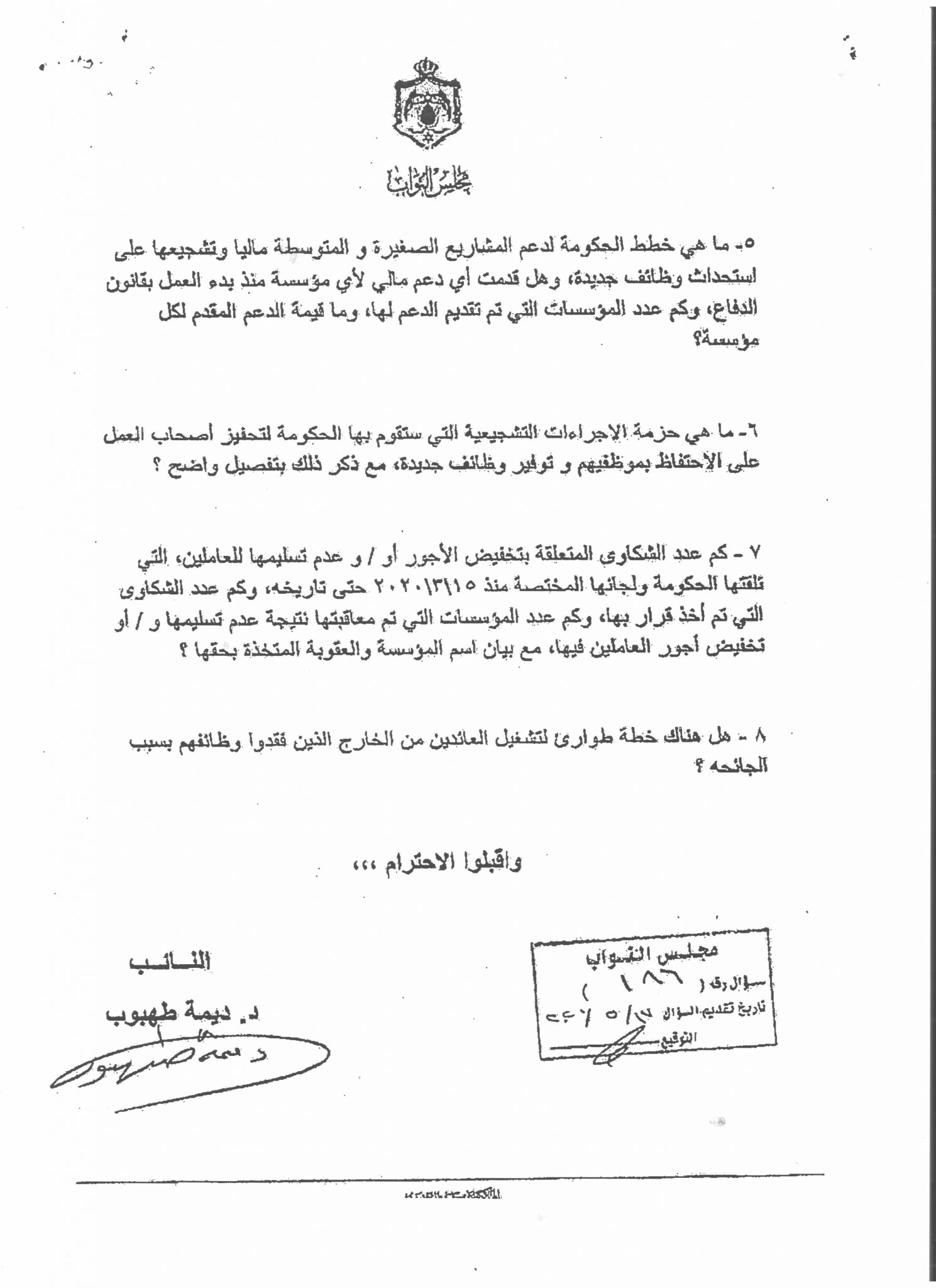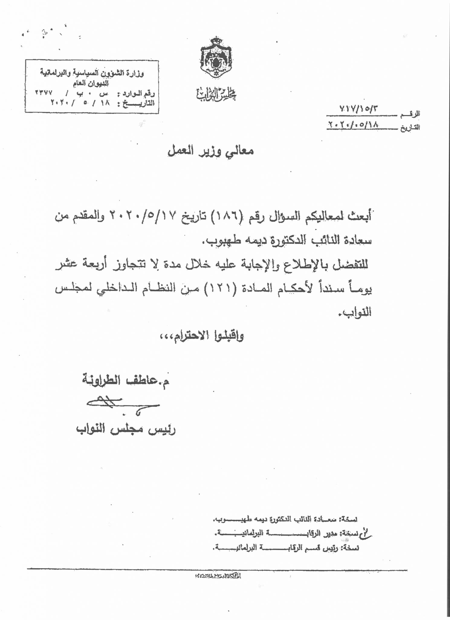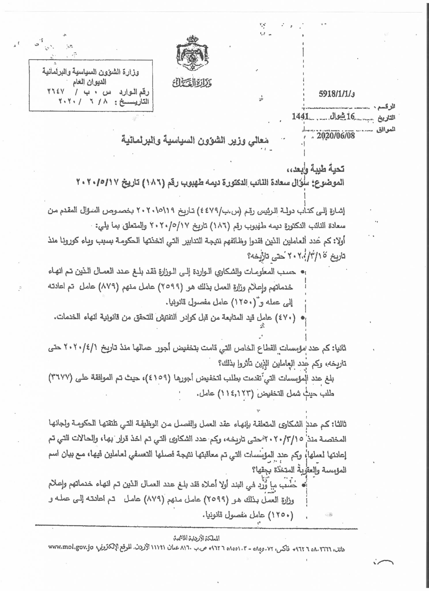 في ١٧-٥ وجهت النائب ديمة طهبوب عضو لجنة العمل النيابية مجموعة من الاسئلة الى الحكومة حول تأثير الجائحه على العمالة الاردنية و خطة الحكومة المستقبلية للتعامل مع اثار الأزمة على العمل و العمال خصوصا و ان أحد مراكز الدراسات الاردنية تنبأ بفقدان ١٤٠ الف عامل لوظائفهم