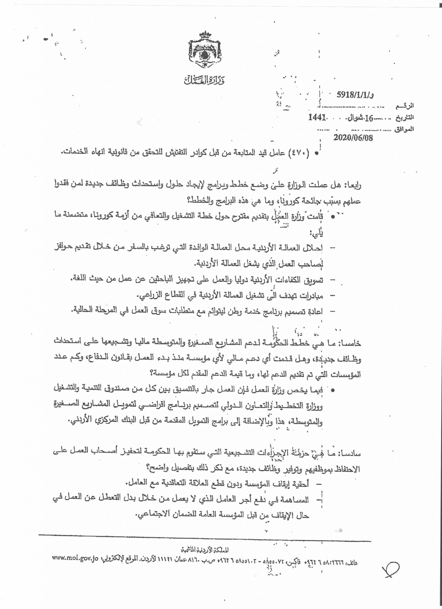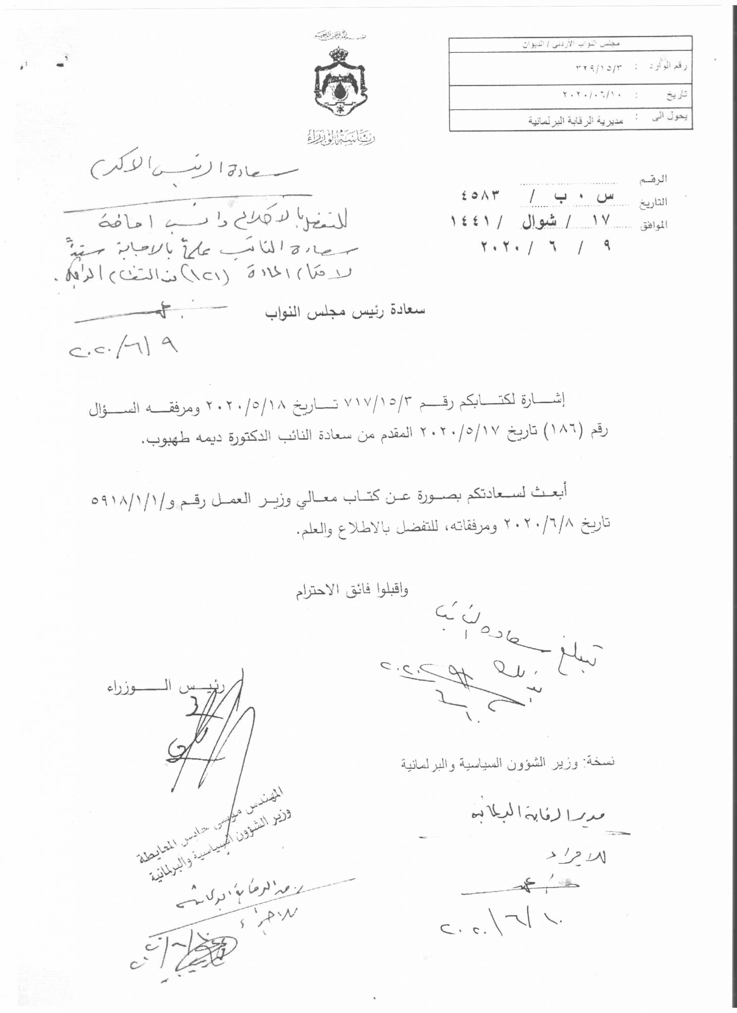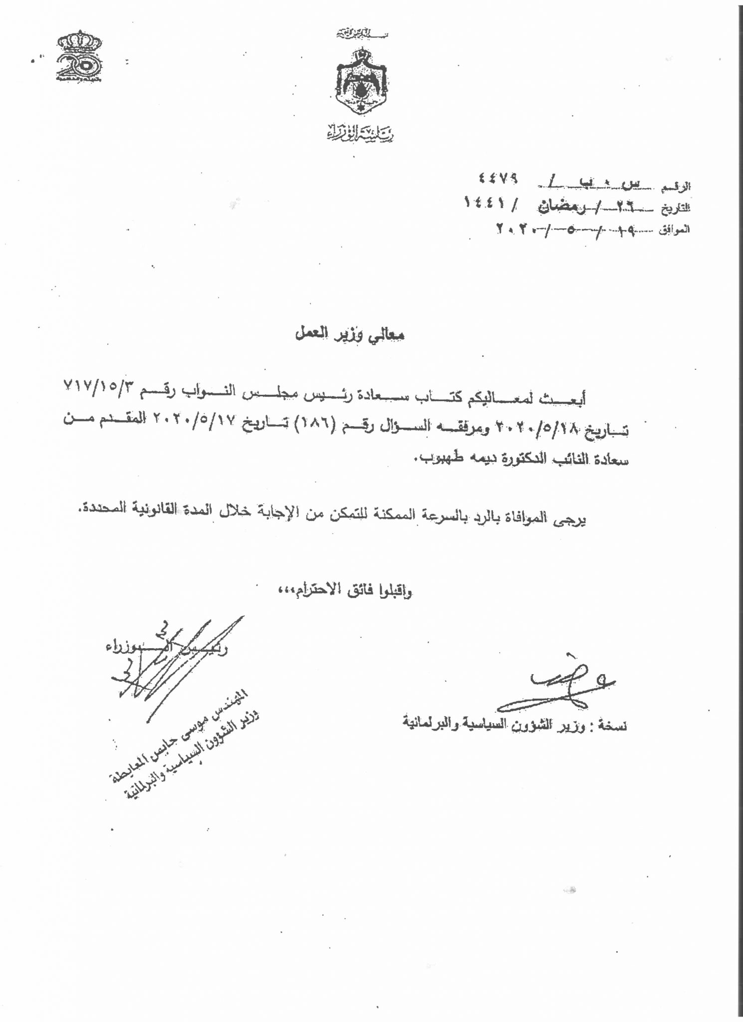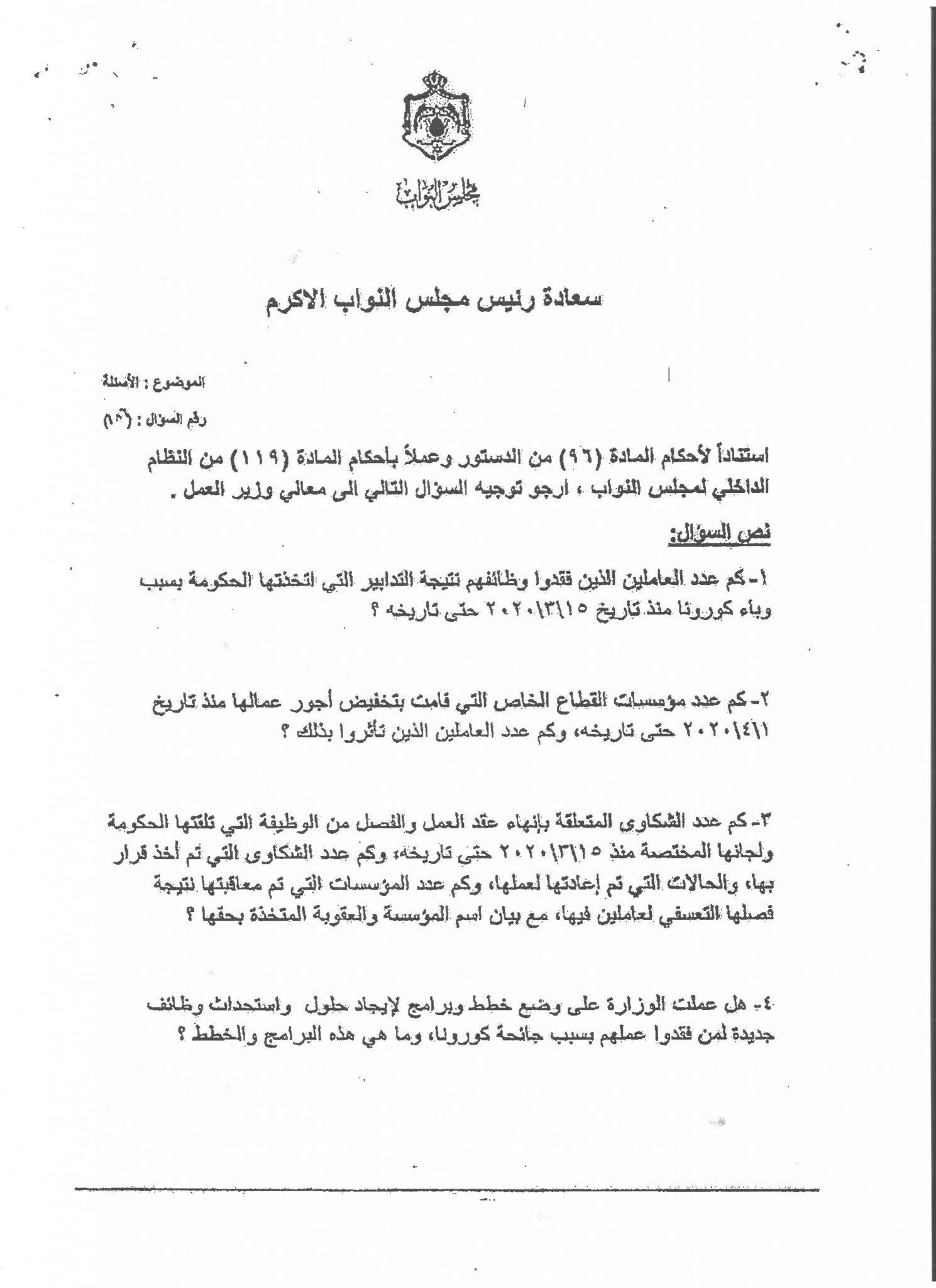 في ١٧-٥ وجهت النائب ديمة طهبوب عضو لجنة العمل النيابية مجموعة من الاسئلة الى الحكومة حول تأثير الجائحه على العمالة الاردنية و خطة الحكومة المستقبلية للتعامل مع اثار الأزمة على العمل و العمال خصوصا و ان أحد مراكز الدراسات الاردنية تنبأ بفقدان ١٤٠ الف عامل لوظائفهم