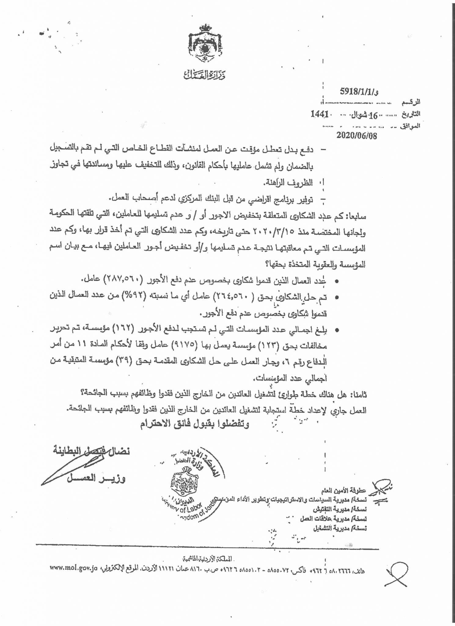 وقات الوزارة في إجاباتها ان عدد المؤسسات التي قدمت طلبات لتخفيض الأجور اعتباراً من تاريخ ١-٤-2020 قد بلغ ٤١٥٩ وافقت الوزارة على ٣٦٧٧ طلب وشمل التخفيض ١١٤,١٢٣ عامل.