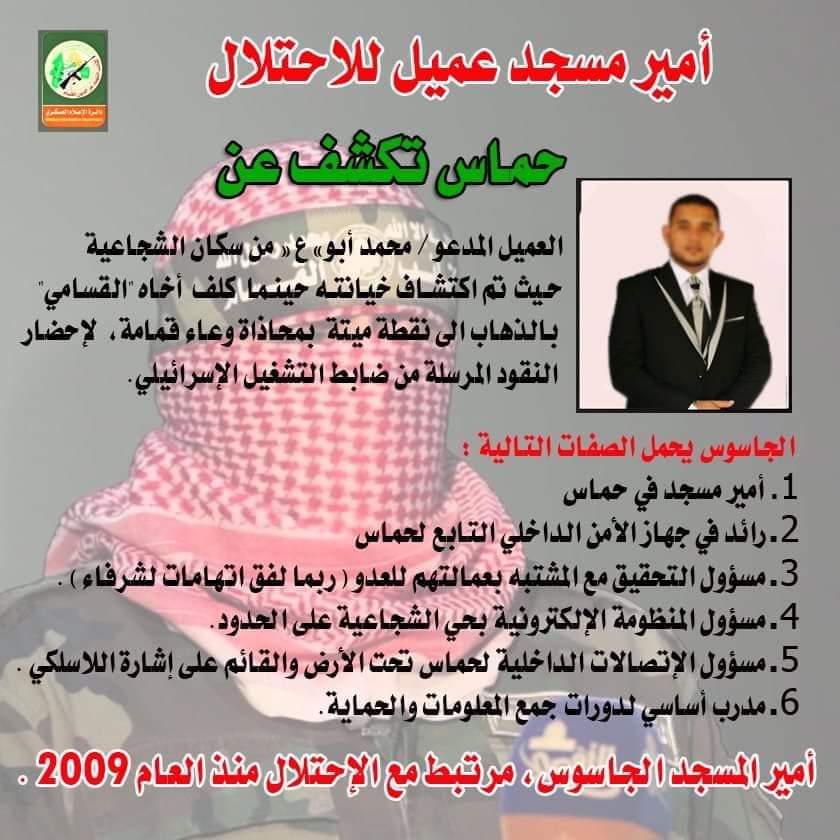يذكر ان العملاء والجواسيس في حركة حماس تسببوا بمقتل عدد كبير من المسؤولين والقيادات السرية للحركة في الوقت الذي تتهم حماس السلطة الفلسطينية بالاستمرار في عملية التنسيق الامني التي تعتبرها ضارة بالقضية الفلسطينية