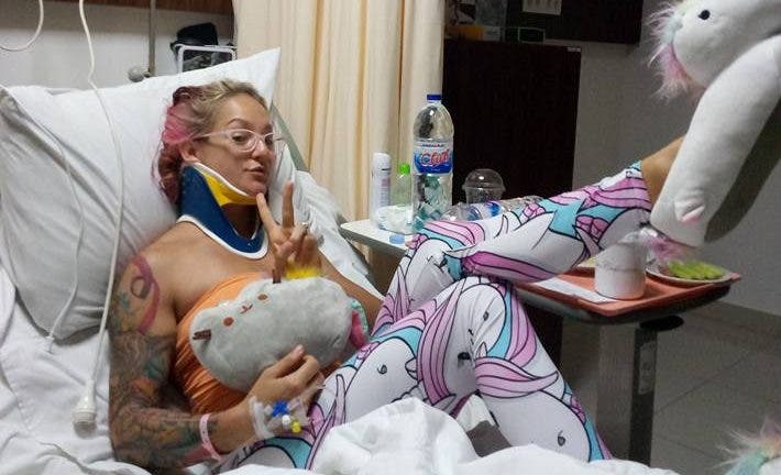يذكر أن احتلت "سام" عناوين الصحف في عام 2017 بعد أن أصيبت بجروح بالغة في رقبتها عندما سقطت خلال عرض بهلواني في نادي "فين بيتش" في بالي.