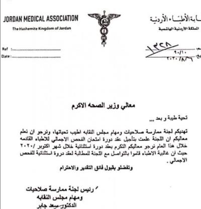 وقال جابر في الكتاب الموجه لنفسه، إن اللجنة علمت بتأجيل عقد دورة امتحان الفحص الاجمالي للأطباء القادمة خلال العام الحالي.
