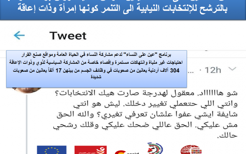 يدين برنامج "عين على النساء" وبشدة الإساءة والتنمر الذين تعرضت لهما الشابة الكفيفة روان بركات على مواقع التواصل الاجتماعي بسبب إعلانها عن نيتها الترشح للإنتخابات النيابية للمجلس التاسع عشر، ويعتبر البرنامج ذلك إساءة مزدوجة للناشطة الاجتماعية روان، فهو من جهة تنمر وإساءة كونها امرأة ترغب في ممارسة حقها في الترشح، وتنمر وإساءة إضافية كونها ذات إعاقة بصرية ومن حقها العيش في بيئة دامجة لكل فئات المجتمع من جهة ثانية.