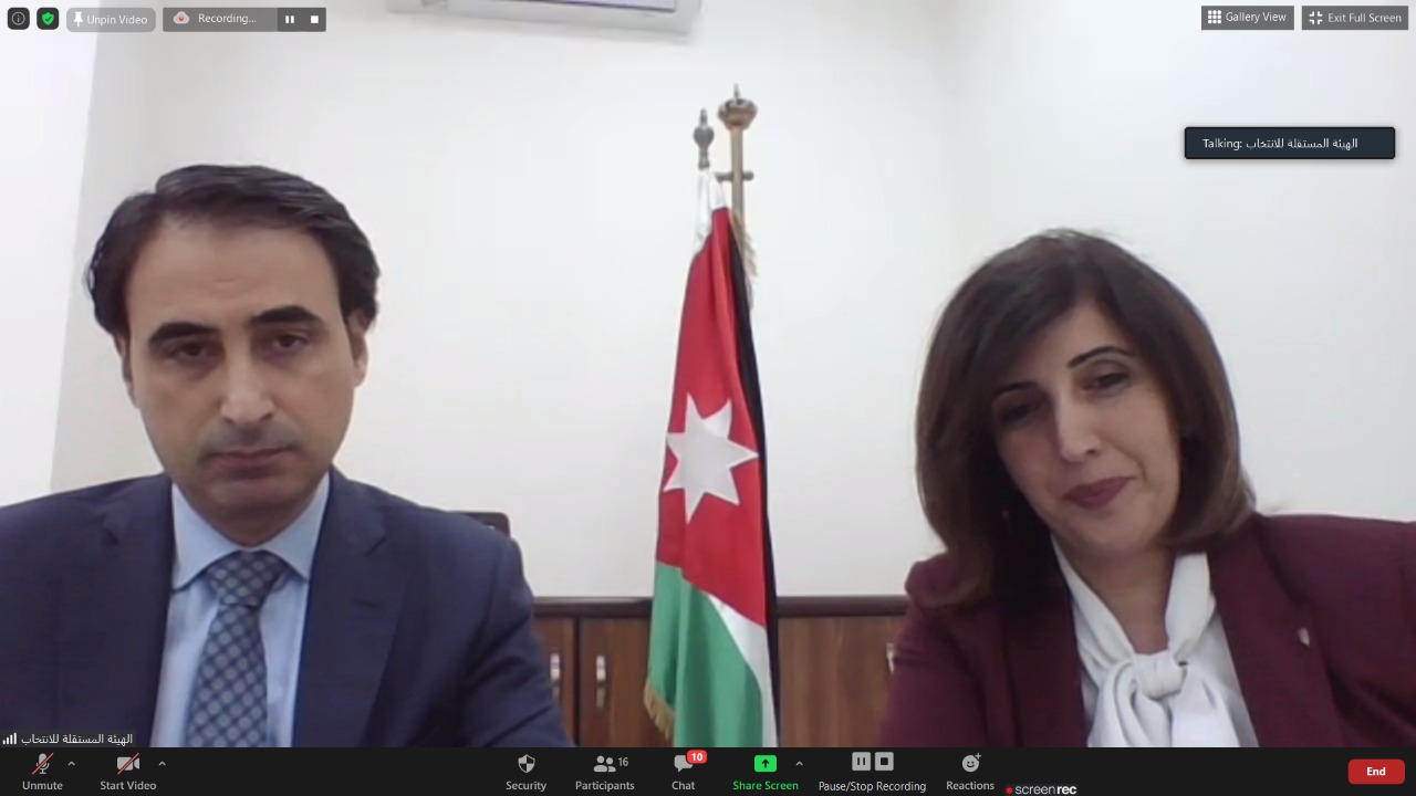 استعرضت الدكتورة عبير دبابنة عضو مجلس مفوضي الهيئة المستقلة للانتخاب استعدادات الهيئة لإجراء الانتخابات النيابية المقبلة للمجلس التاسع عشر والمقرر اجراؤها بتاريخ 10/11/2020 وذلك خلال لقاء عقدته الهيئة المستقلة للانتخاب مع مؤسسات المجتمع المدني في محافظة البلقاء عبر تقنية الاتصال المرئي.