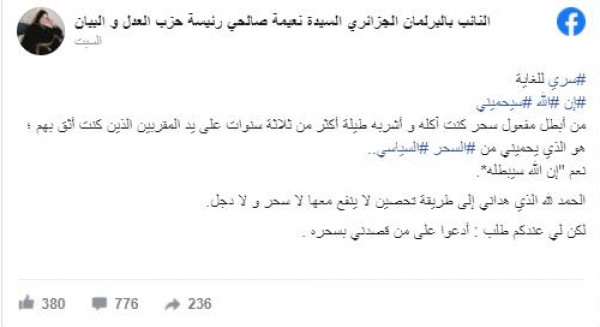 عادت رئيسة حزب العدل والبيان، البرلمانية الجزائرية نعيمة صالحي، لإثارة الجدل بعد زعمها التعرض للسحر طيلة الثلاث سنوات الماضية.