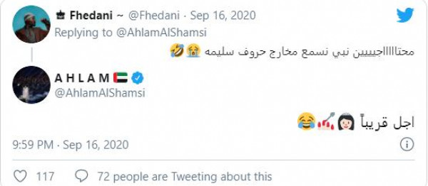 ثم ردت على تعليق لأحد المتابعين الذي أعقب على تغريدتها "محتاجين نببي نسمع مخارج حروف سليمة"، فردت عليه بالقول "أجل قريباً" مع وجوه ضاحكة ايضا.