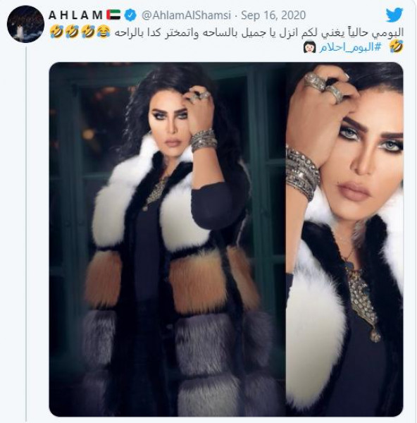 وكتبت أحلام في تغريدتها التالي :"البومي حالياً يغني لكم انزل يا جميل بالساحة، واتمختر كدا بالراحة"، وأرفقت التغريدة بوجوه ضاحكة، وفق ما نقلته (نورت).