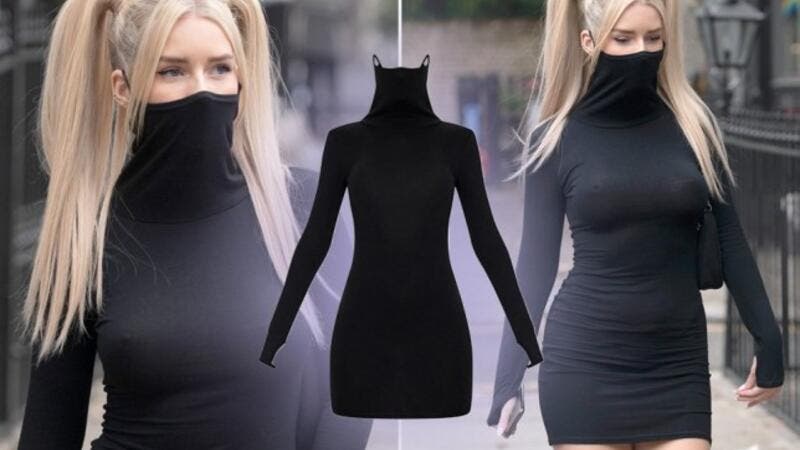 وطرح متجر Pretty Little Thing فستانًا أسود مُدمجًا بقناع واقٍ من أجل الحفاظ على الأناقة والإطلالة الساحرة وسط أزمة جائحة "كورونا" المُستجد.