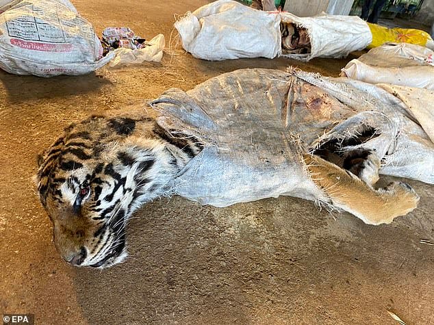 وكان من بين منتجات الحياة البرية التي تم ضبطها أكثر من 130 نمرًا حيًا وأكثر من 40 نمر ميتًا وجلد النمر و 1500 تميمة من جلد النمر.