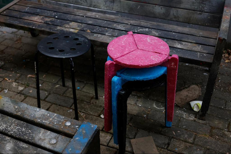 والنتيجة مقاعد بثلاثة أرجل من الكمامات البيضاء والوردية والزرقاء والسوداء عرضها كيم في معرض تخرجه.