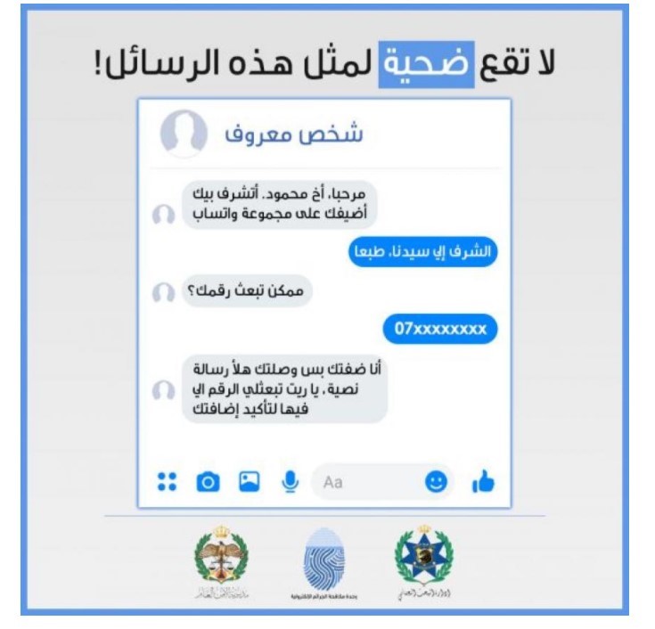 " الجرائم الإلكترونية" في مديرية الأمن العام، كانت حذرت من أشخاص يقومون بسرقة حسابات واتساب بهدف الاحتيال المالي، من خلال ايهام المواطنين باضافتهم عبر مجموعات.