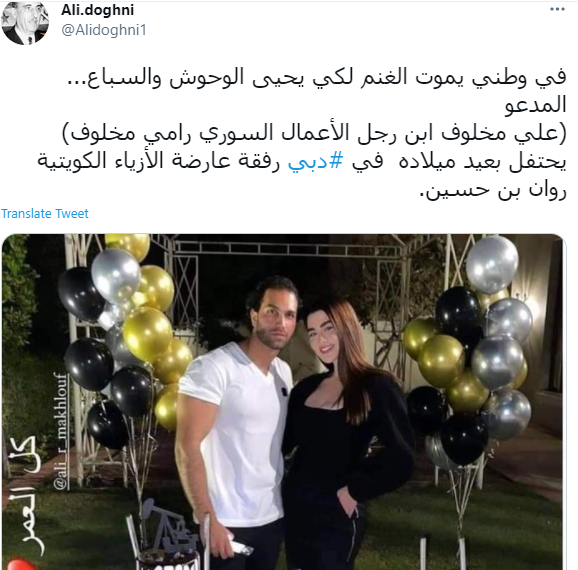 تداول رواد السوشال ميديا صُورة جديدة للفاشنيستا الكويتية روان بن حسين برفقة شاب يدعى علي مخلوف الذي اتضح أنه نجل رجل الأعمال السوري رامي مخلوف والذي هو إبن خال الرئيس السوري بشار الأسد.