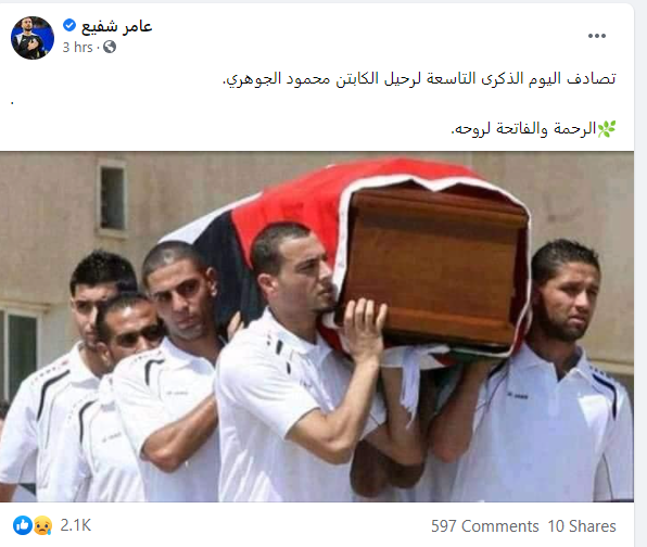 حارس المنتخب الوطني السابق عامر شفيع استذكر المرحوم ونشر صورة له وهو يحمل جثمانه وكتب " تصادف اليوم الذكرى التاسعة لرحيل الكابتن محمود الجوهري.