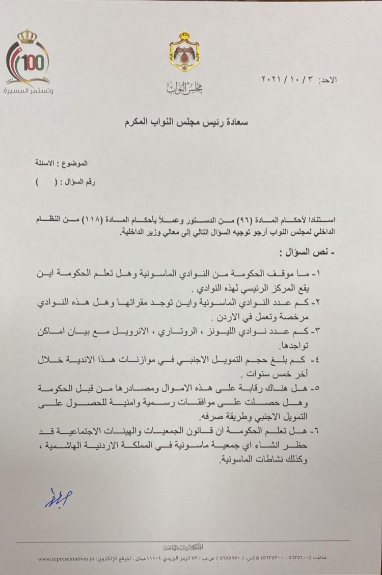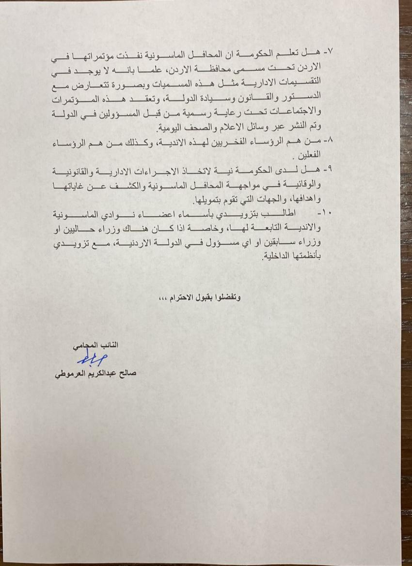 وتساءل العرموطي عن الرؤساء الفخريين لهذه الأندية ومن هم الرؤساء الفعليين ، وهل لدى الحكومة نية لاتخاذ الاجراءات الادارية والقانونية والوقائية في مواجهة المحافل الماسونية والكشف عن غاياتها واهدافها، والجهات التي تقوم بتمويلها، كما طلب ان يتم تزويده بأسماء اعضاء نوادي الماسونية والاندية التابعة لها، وخاصة اذا كان هناك وزراء حاليين او وزراء سابقين او اي مسؤول في الدولة الاردنية، مع تزويدي بأنظمتها الداخلية.