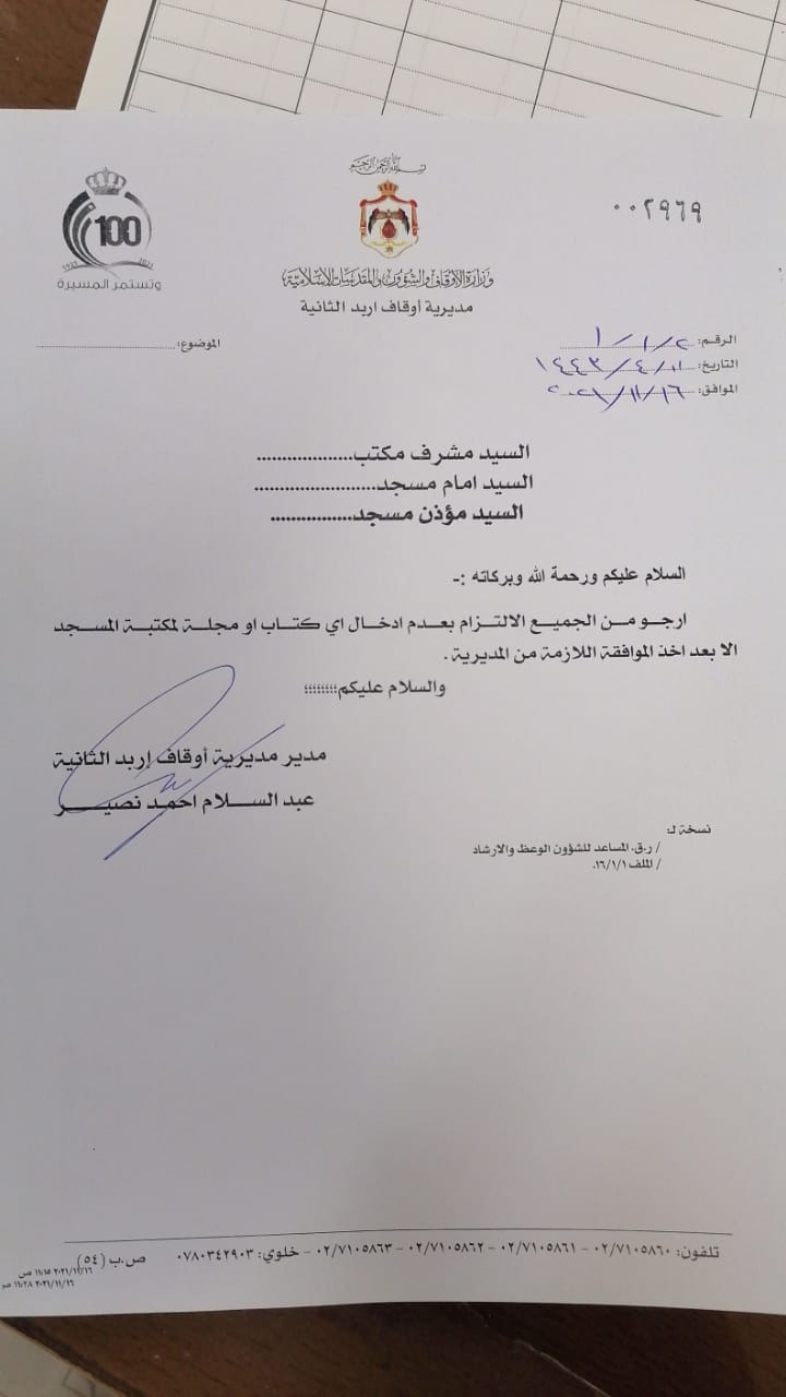 وحصلت "زاد الاردن"، على أحد كتب التعميم، الذي ألزم بالحصول على موافقة المديرية قبل تزويد مكاتب المساجد بالكتب والمجلات.