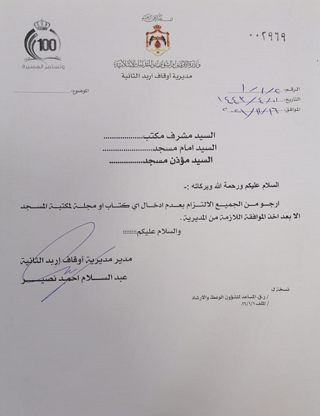 ونصّ أحد كتب التعميم، الذي ألزم بالحصول على موافقة المديرية قبل تزويد مكاتب المساجد بالكتب والمجلات.