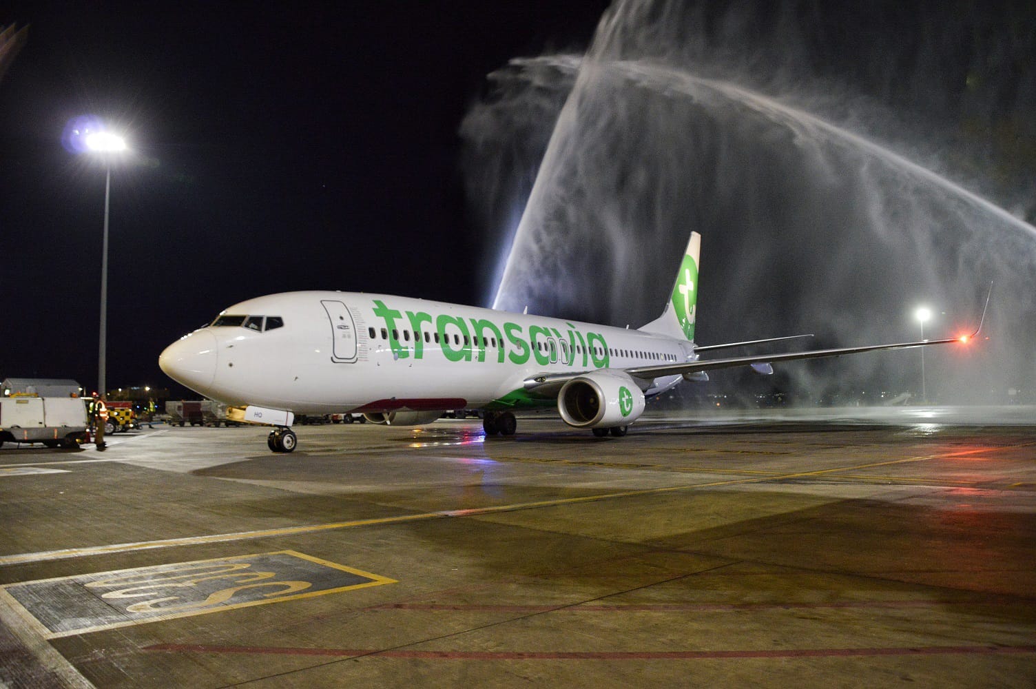 واستقبلت الطائرة لحظة هبوطها بالمطار، بتحية "أقواس الماء" التقليدية بحضور ممثلين عن هيئة تنشيط السياحة و مجموعة المطار الدولي وممثلين عن خدمة المناولة الأرضية الخاصة بشركة طيران ترانسافيا – الملكية الأردنية، ووكيل سفرياتها في الأردن.
