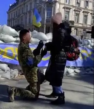 ونشرت وزارة الخارجية الأوكرانية، السبت، فيديو للجندي وهو يطلب يد حبيبته.